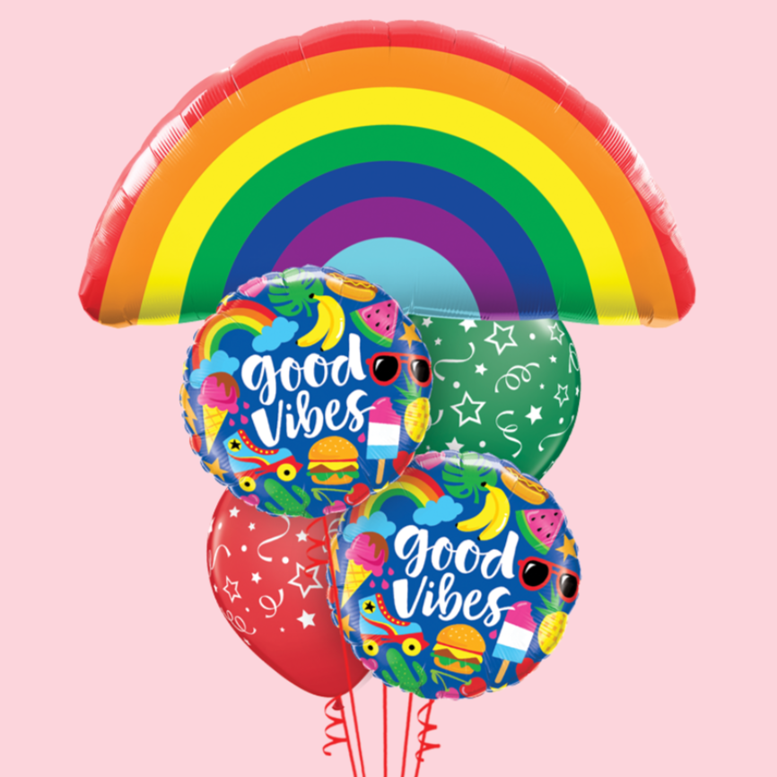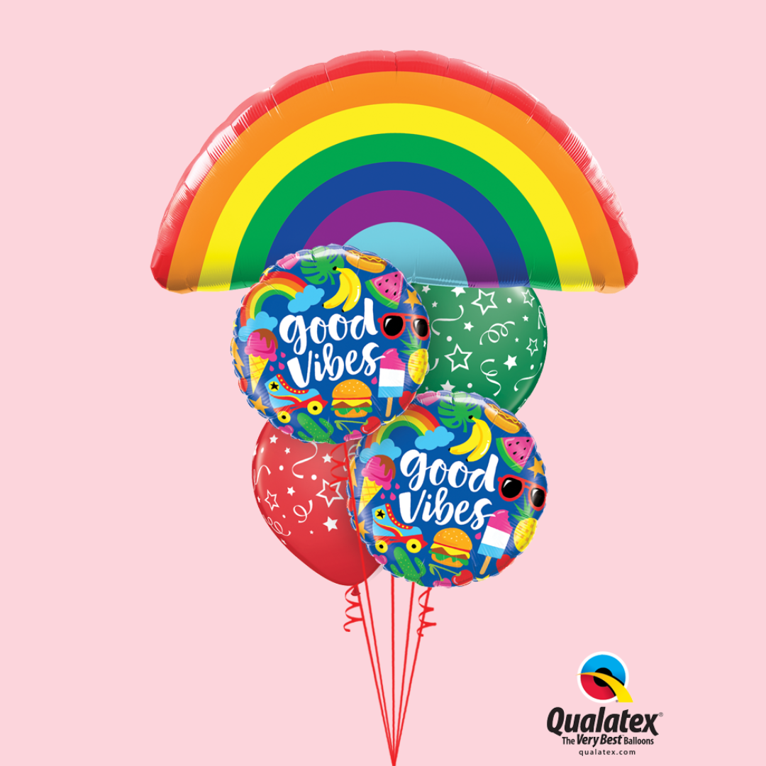 The Life is Good, Take it Slow product presents a visually striking arrangement with a rainbow arch and a quartet of balloons, creating an inviting canopy of colour while maintaining proportionate sizing for both intimate and expansive settings. Composed with smooth, rounded edges and glossy finish balloons, complemented by a subdued satin sheen rainbow arch, the ensemble offers a harmonious balance and celebratory aesthetic.