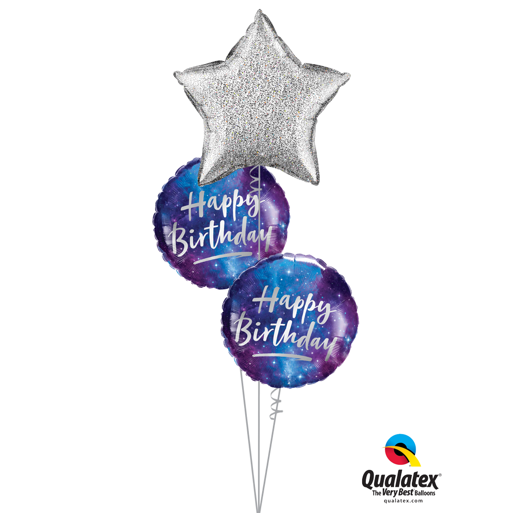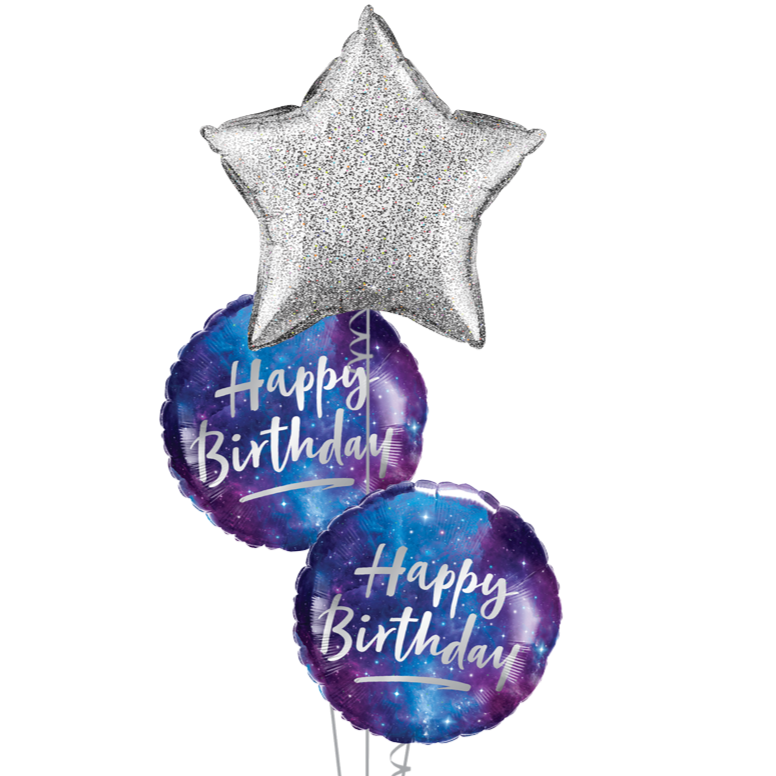 Celebrate the shining star in your life with the "You're a Star!" Bouquet, a stunning collection of balloons designed to make their special day even brighter. Featuring a glittering 50cm star balloon at its heart, accompanied by two 45cm "Happy Birthday Galaxy" foil balloons, this ensemble captures the essence of stardom and celestial charm.
